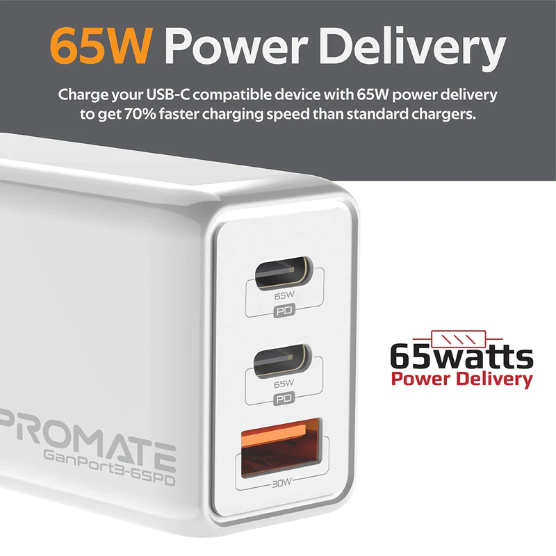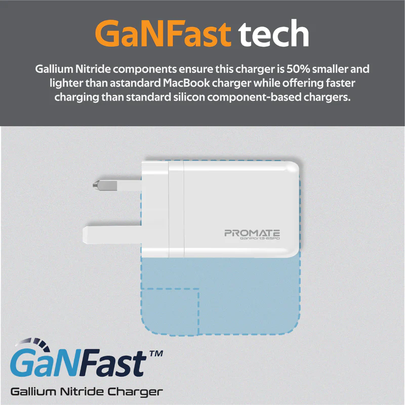 Promate GaNPort3-65PD 65W Power Delivery GaNFast™ Charging Adaptor